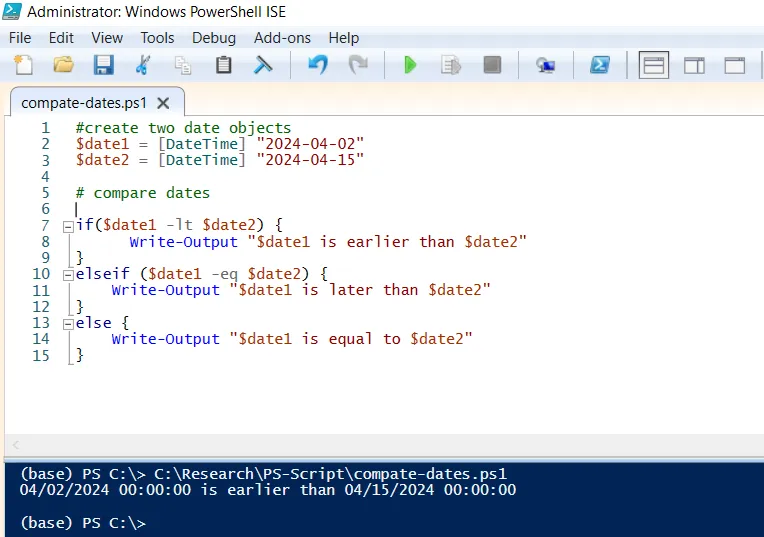 In the following PowerShell script, we have created two arrays $array1 and $array2. The Compare-Object cmdlet uses the both array to compare the two array and store the true or false value in $result variable.