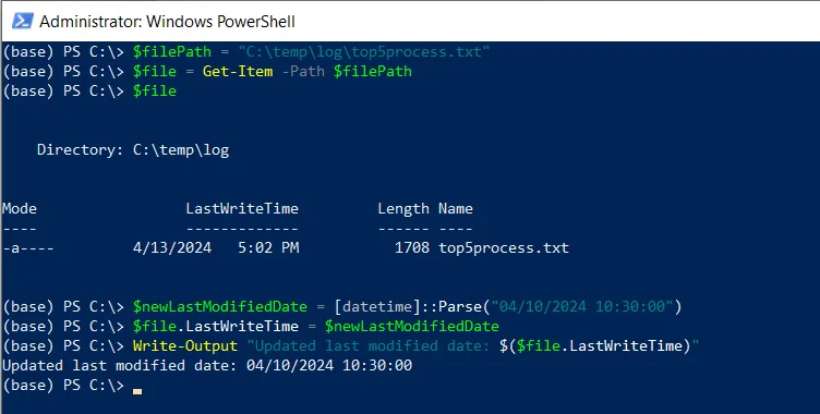 Next, we define a new creation date using the [datetime]::Parse("04/10/2024 10:30:00") and store it in the $newLastModifiedDate Variable. This example sets the date to April 10, 2024, at 10:30 AM.
