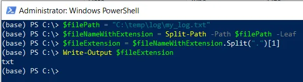 Finally, we call the Split() method over the $fileNameWithExtension variable to extract the file extension and output to the console using the Write-Output cmdlet.