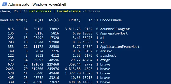 Get-Process | Format-Table -Autosize