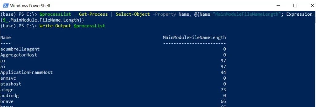 $processList = Get-Process | Select-Object -Property Name, @{Name="MainModuleFileNameLength"; Expression={$_.MainModule.FileName.Length}}
